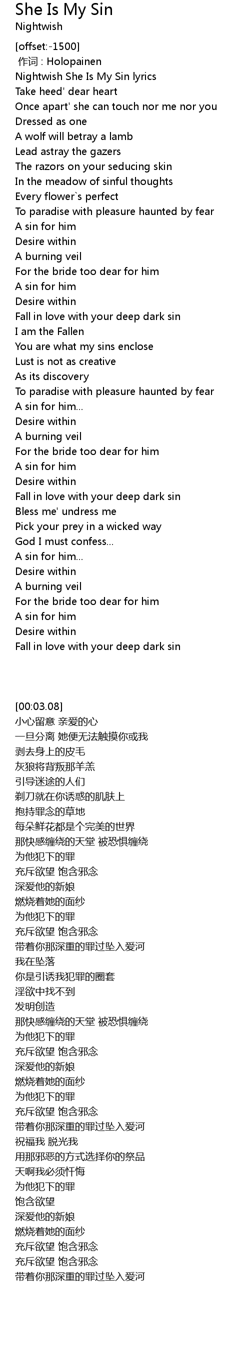 | [00:03.08] | Nightwish She Is My Sin lyrics |