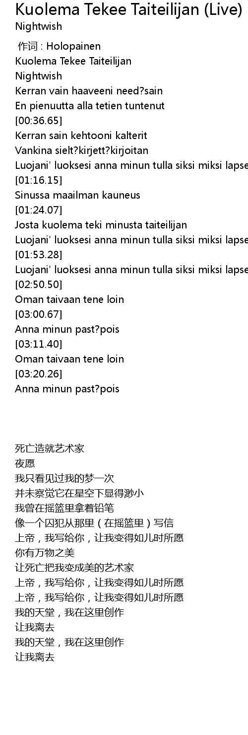 | [00:02.18] | Kuolema Tekee Taiteilijan |