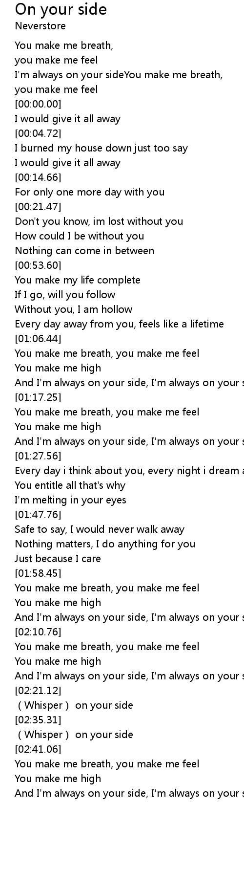 | [00:00.00] | I'm always on your sideYou make me breath, |