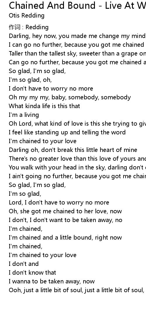 | I ain't going no further, because you got me chained and bound, oh now | |