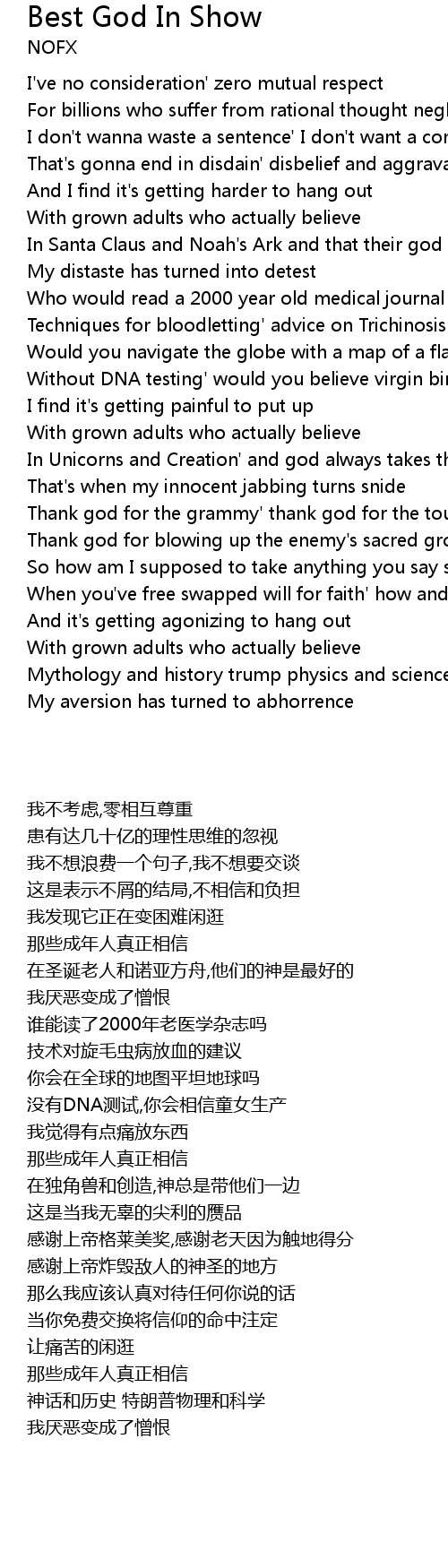 | [01:11.22] | In Santa Claus and Noah's Ark and that their god is the best |