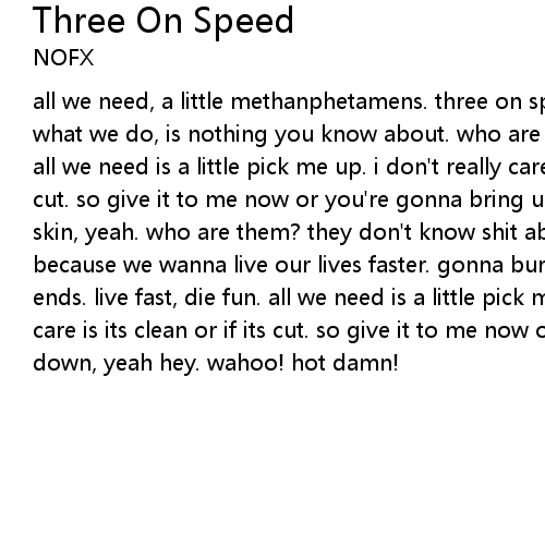 all we need, a little methanphetamens. three on speed. a little subversality. what we do, is nothing you know about. who are you? definently not one of us. all we need is a little pick me up. i don't really care is its clean or if its cut. so give it to me now or you're gonna bring us down, yeah hey. give me some skin, yeah. who are them? they don't know shit about us. different strokes, because we wanna live our lives faster. gonna burn the candle down at all three ends. live fast, die fun. all we need is a little pick me up. i don't really care is its clean or if its cut. so give it to me now or you're gonna bring us down, yeah hey. wahoo! hot damn! |