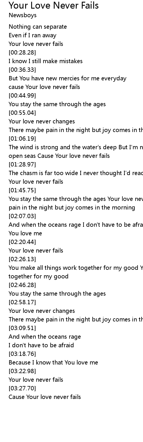 The chasm is far too wide I never thought I'd reach the other side But Your love never fails |