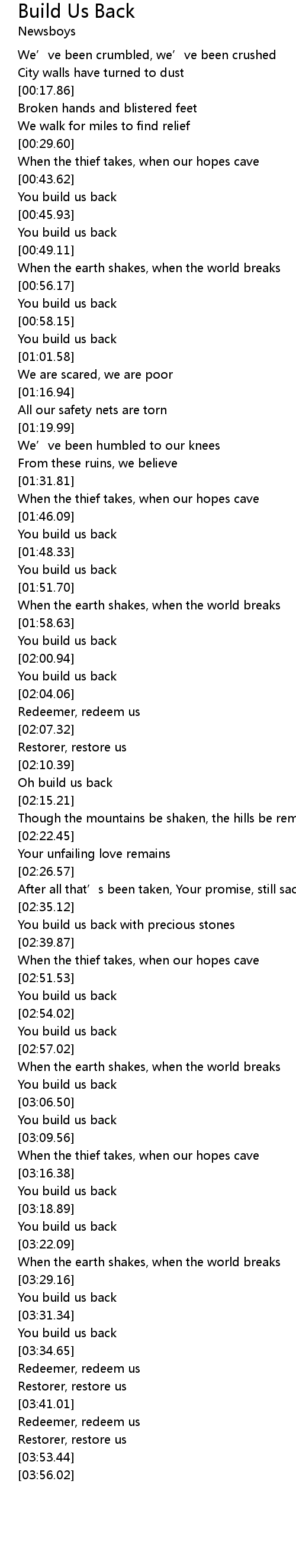 | [02:29.50] | After all that’s been taken, Your promise, still sacred |