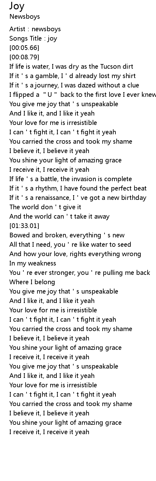 | [00:41.54] | You give me joy that s unspeakable |