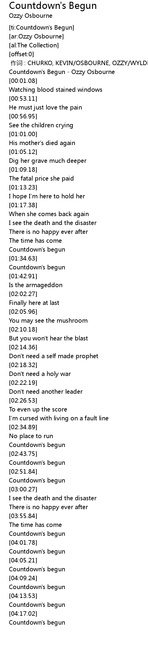 | [00:00.06] | Countdown's Begun - Ozzy Osbourne |