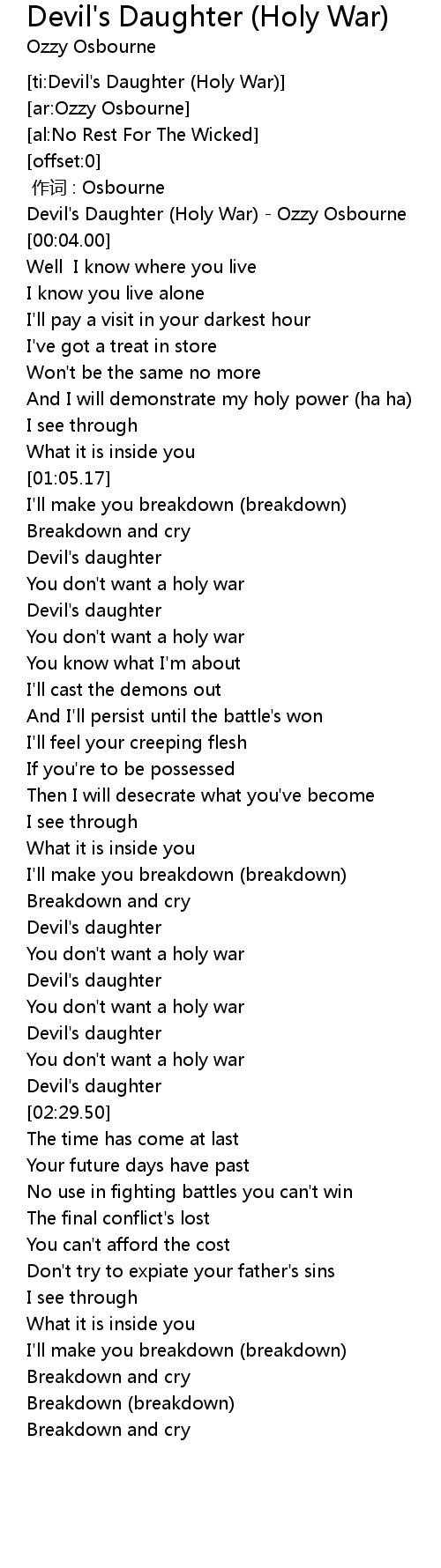 | [00:01.94] | Devil' s Daughter Holy War Ozzy Osbourne |