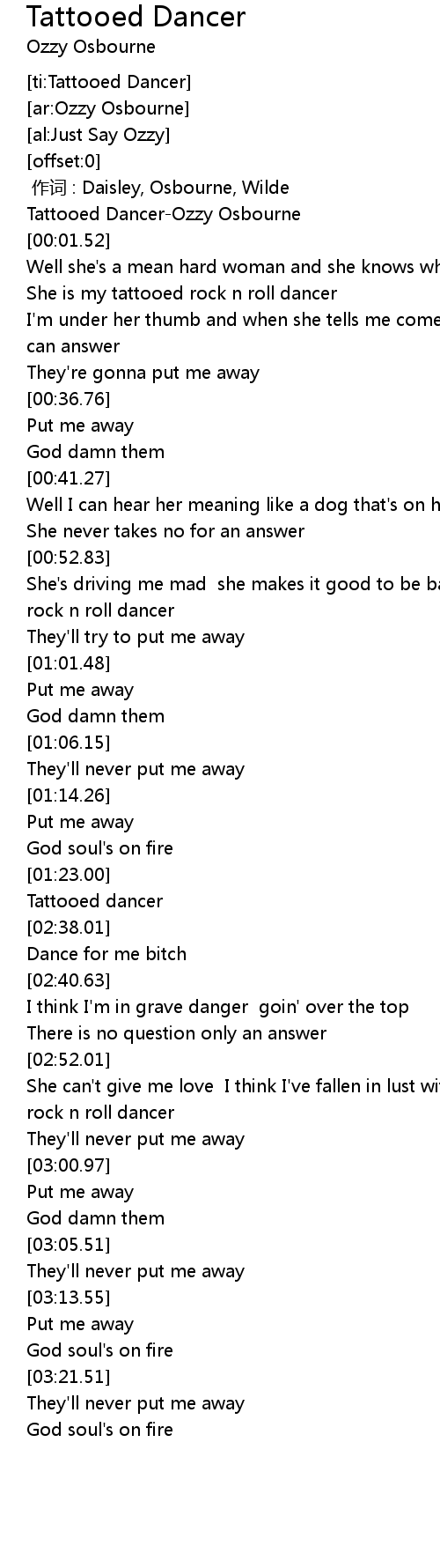 | [00:00.87] | Tattooed Dancer-Ozzy Osbourne |