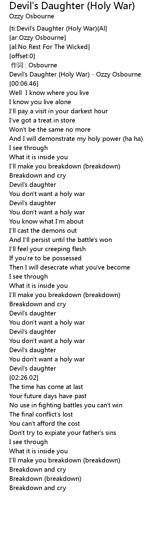 | [00:00.96] | Devil' s Daughter Holy War Ozzy Osbourne |