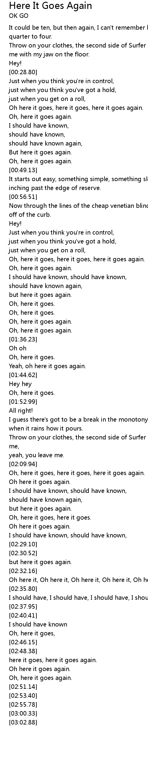 | [00:36.36] | Oh here it goes, here it goes, here it goes again. |