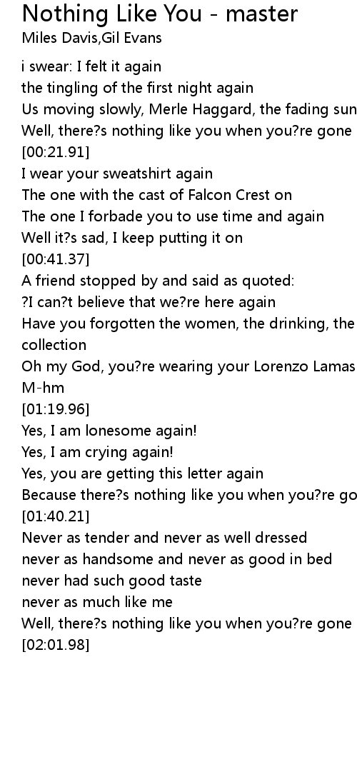 | [01:35.26] | Because there?s nothing like you when you?re gone |