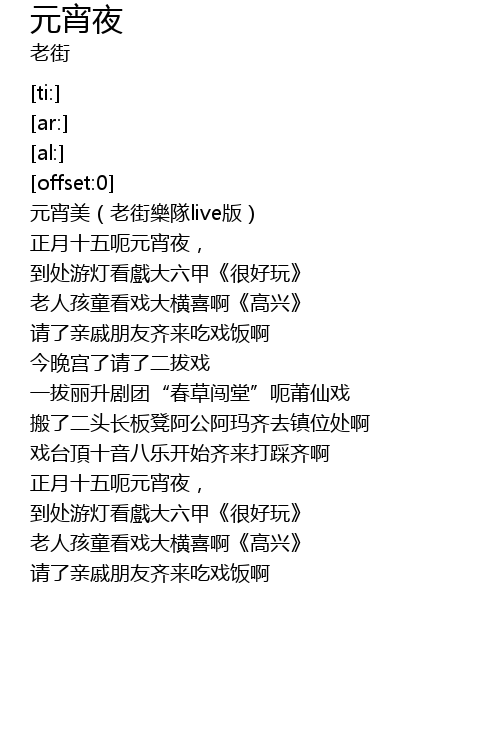 | [00:02.28] | 元宵美(老街樂隊live版) |