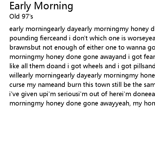 early morningearly dayearly morningmy honey done gone awaydamn my head's pounding fierceand i don't which one is worseyeah i got brains and i got brawnsbut not enough of either one to wanna go onearly morningearly dayearly morningmy honey done gone awayand i got fears i'm afraid of yougonna dissappear like all them doand i got wheels and i got pillsand if you don't kill me nothing willearly morningearly dayearly morningmy honey done gone awaykick my head and curse my nameand burn this town still be the samei had hope now i got nonewell i've given upi'm seriousi'm out of herei'm doneearly morningearly dayearly morningmy honey done gone awayyeah, my honey done gone away