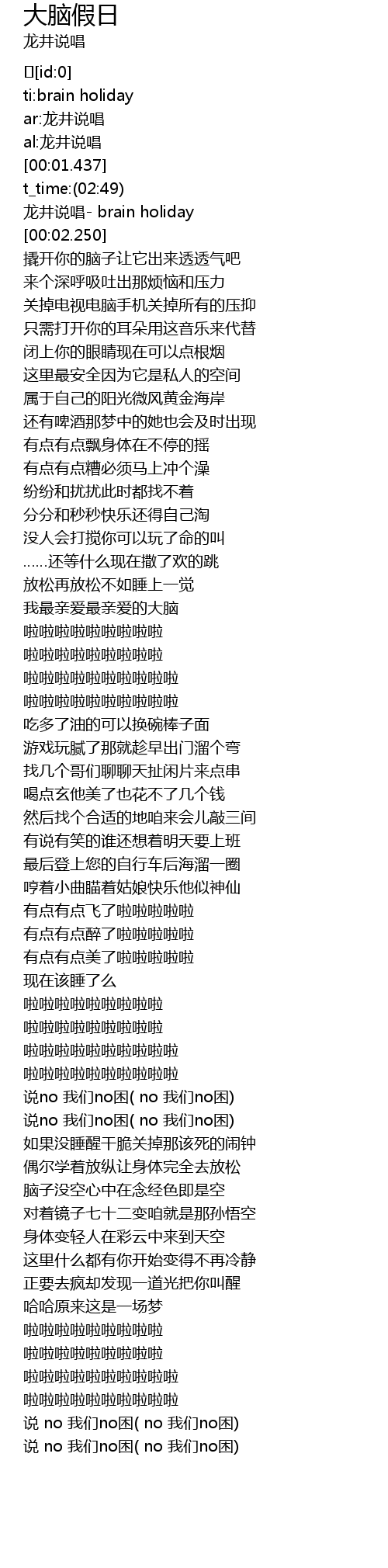 | [00:01.538] | lóng jǐng shuō chàng brain holiday |