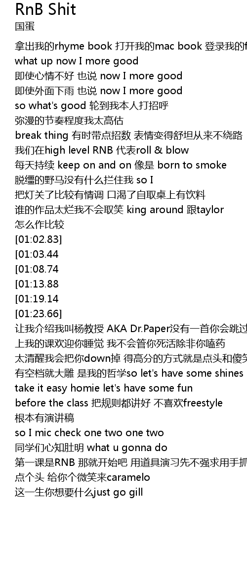 | [02:16.43][01:13.88] | zhè shì wǒ de RNB Shit nǐ zuì xǐ huān de Rap shit |