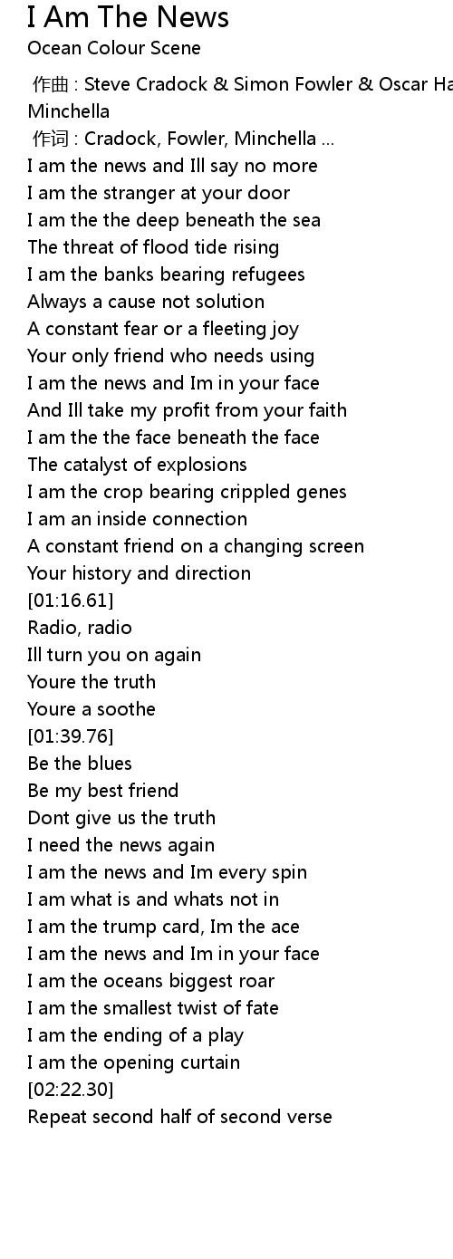 | [00:01.00] | 作词 : Cradock, Fowler, Minchella ... |