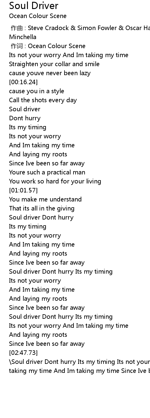 | [02:52.91] | Soul driver Dont hurry Its my timing Its not your worry And Im taking my time And Im taking my time Since Ive been so far away |