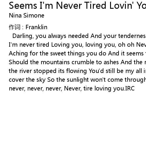 | Darling, you always needed And your tenderness is needed too And it seems that I'm never tired Loving you, loving you, oh oh Never was a feeling stronger Aching for the sweet things you do And it seems that I'm never tired loving you Should the mountains crumble to ashes And the rain should cease to fall And if the river stopped its flowing You'd still be my all in all And if the clouds cover the sky So the sunlight won't come through Then I will never, never, never, never, never, Never, tire loving you.IRC |