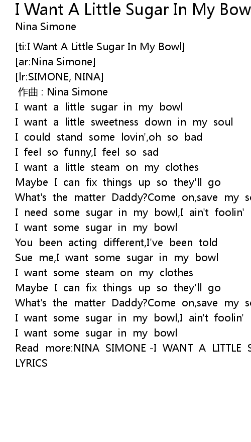 | [02:20.56] | Read more: NINA SIMONE I WANT A LITTLE SUGAR IN MY BOWL LYRICS |