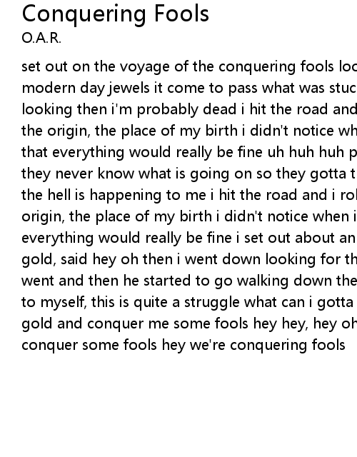 set out on the voyage of the conquering fools looking for the gold and the modern day jewels it come to pass what was stuck in my head if i didn't quit on looking then i'm probably dead i hit the road and i rolled up north looking for the origin, the place of my birth i didn't notice when i ran a red sign hoping that everything would really be fine uh huh huh people come and people go but they never know what is going on so they gotta try to be what they wanna be what the hell is happening to me i hit the road and i rolled up north looking for the origin, the place of my birth i didn't notice when i ran a red sign hoping that everything would really be fine i set out about an hour ago looking for some gold, said hey oh then i went down looking for the big the big brass show so i went and then he started to go walking down the same old, same old road thinking to myself, this is quite a struggle what can i gotta do tomorrow gonna find that gold and conquer me some fools hey hey, hey oh conquering fools conquering fools conquer some fools hey we're conquering fools |