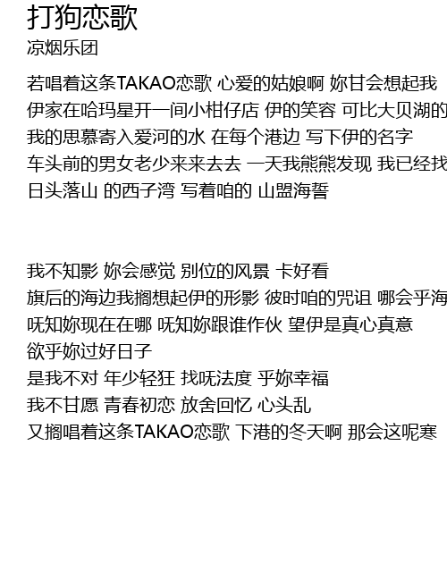 | 又搁唱着这条TAKAO恋歌 下港的冬天啊 那会这呢寒 |