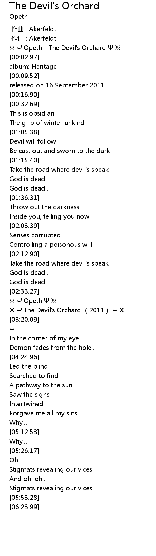 | [00:00.83] | ※ Ψ Opeth - The Devil's Orchard Ψ ※ |