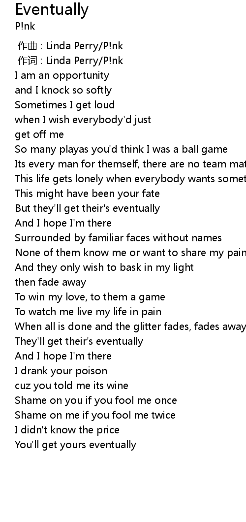 | [00:01.00] | 作词 : Linda Perry/P!nk |