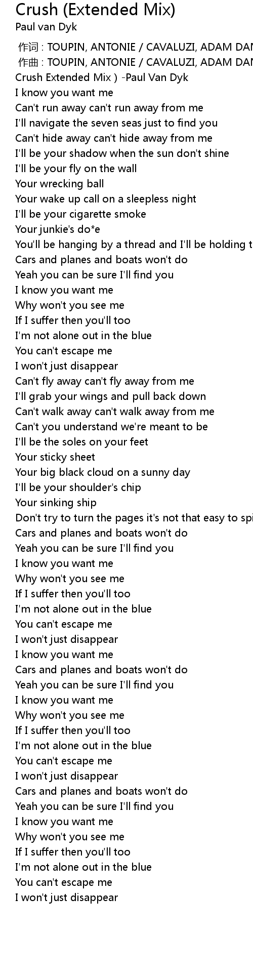 | [00:00.280] | Crush Extended Mix)-Paul Van Dyk |