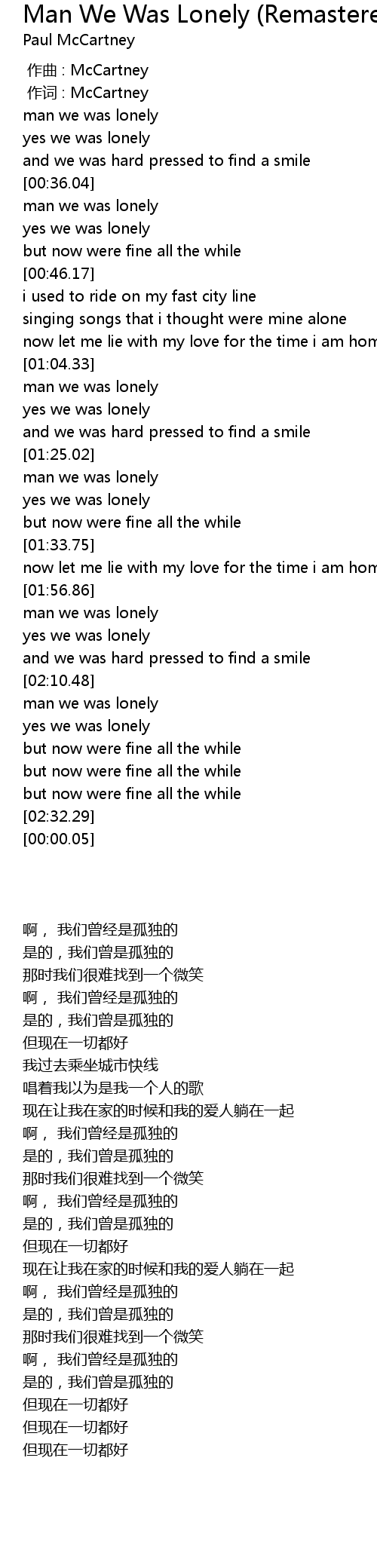 | Song | Man We Was Lonely (Remastered 2011) - 2011 Remaster |