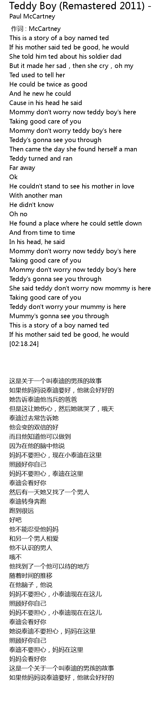 | [01:40.18] | Mommy don' t worry now teddy boy' s here |