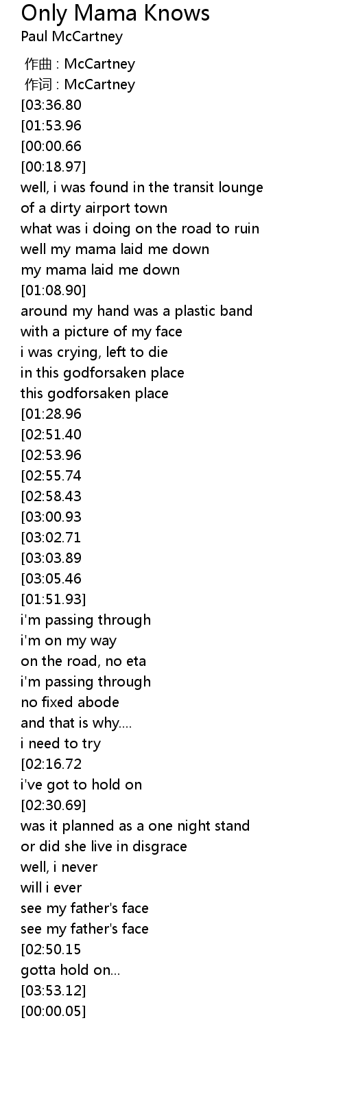 | [04:01.40][01:53.96][00:00.87] | paul mccartneyr-only mama knows |