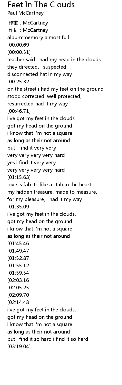 | [02:53.37][00:00.69] | paul mccartneyrfeet in the clouds |