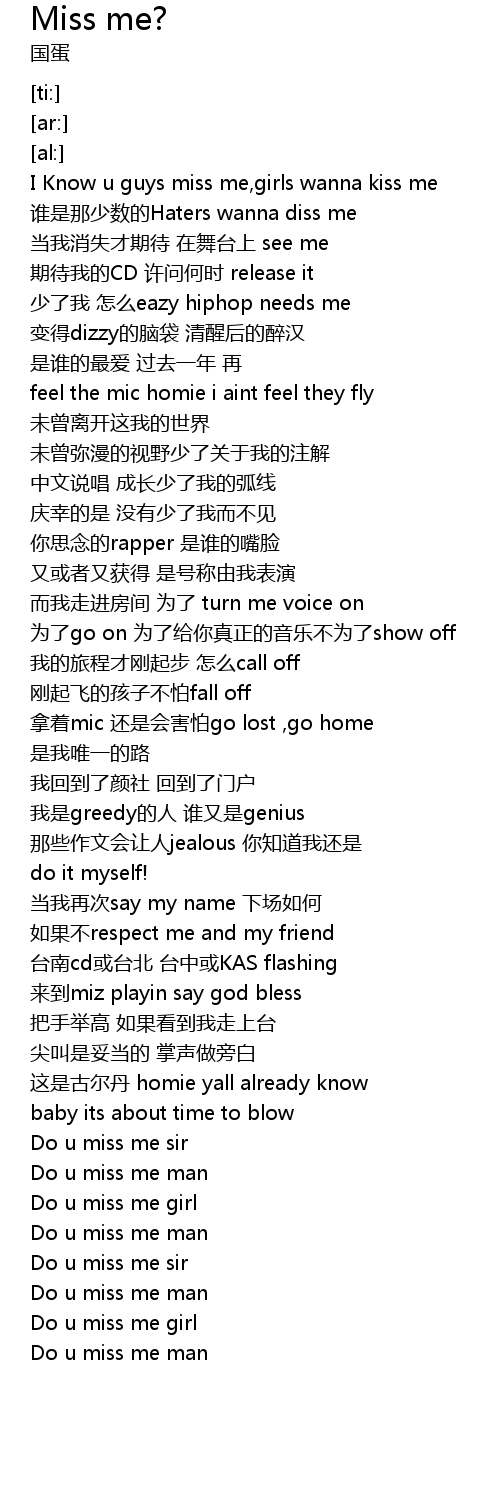 | [00:20.99] | I Know u guys miss me, girls wanna kiss me |