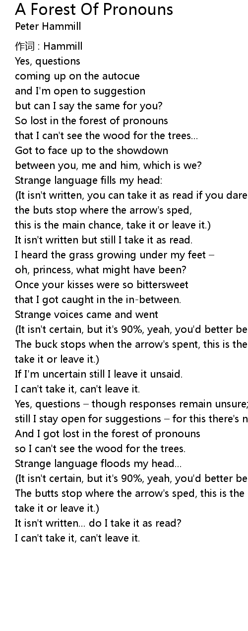 | Song | A Forest Of Pronouns |