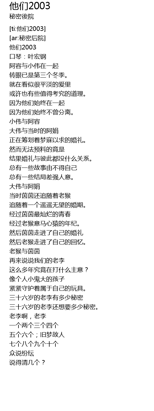 | [04:14.675] | 三十六岁的老李还想要多少秘密。 |