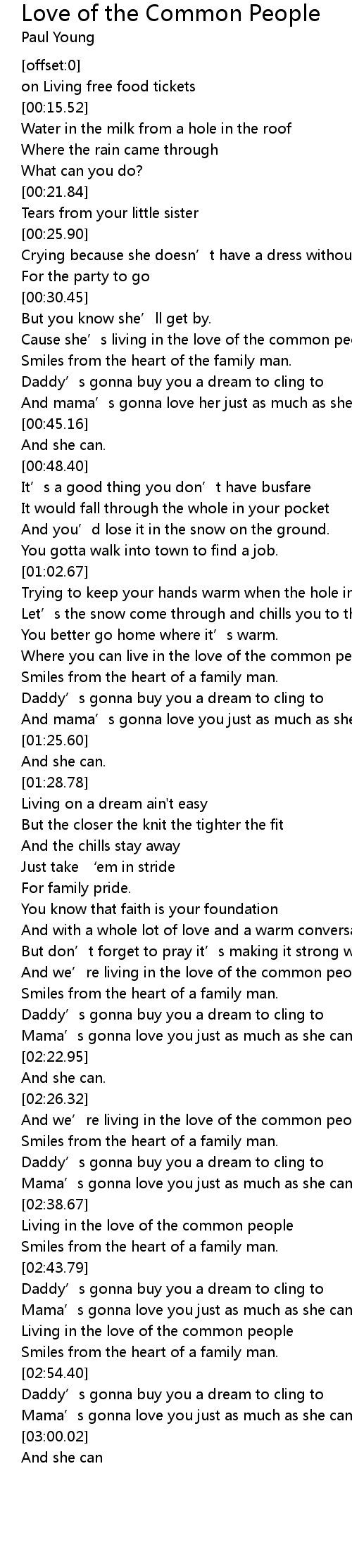 | [00:34.05] | Cause she’s living in the love of the common people |