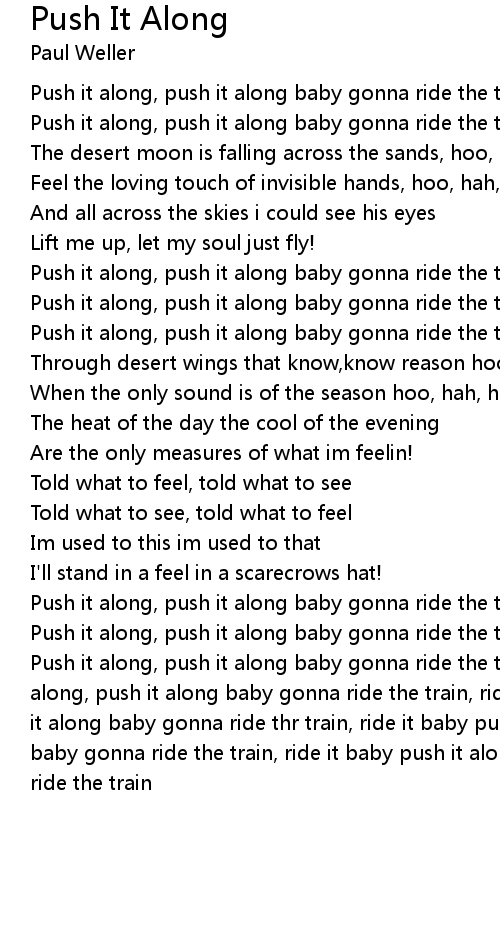 Push it along, push it along baby gonna ride the train, ride it baby push it along, push it along baby gonna ride the train, ride it baby push it along, push it along baby gonna ride thr train, ride it baby push it along, push it along baby gonna ride the train, ride it baby push it along, push it along baby gonna ride the train |