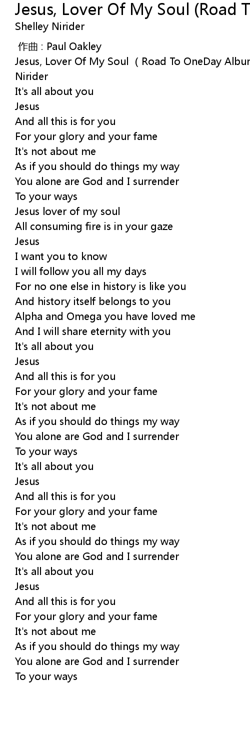 | [00:00.200] | Jesus, Lover Of My Soul Road To OneDay Album Version Shelley Nirider |