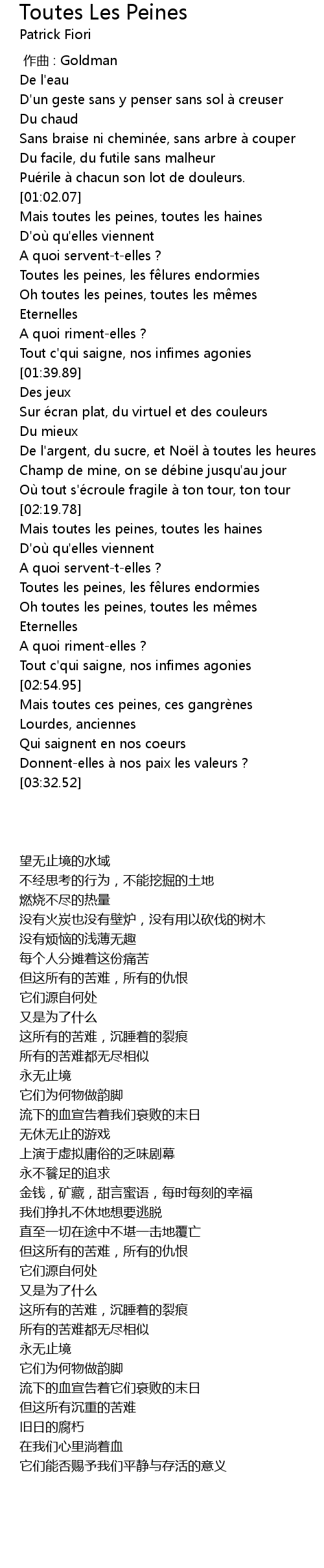 | [02:39.48] | Oh toutes les peines, toutes les m mes |