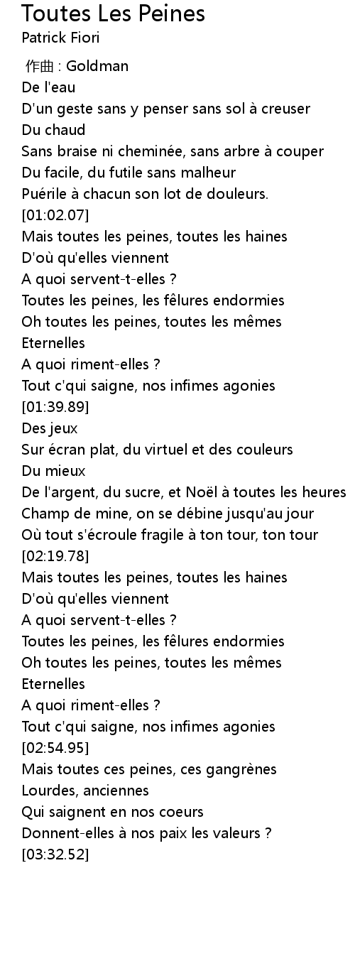 | [02:39.48] | Oh toutes les peines, toutes les m mes |