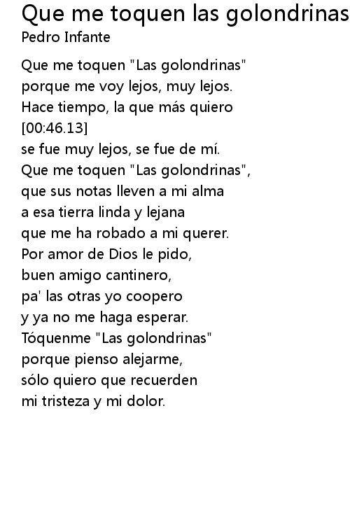 | [00:59.36] | Que me toquen " Las golondrinas", |