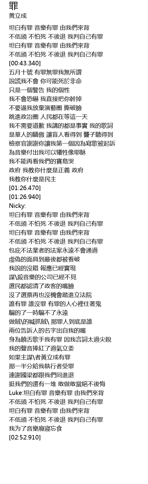| [02:36.650] | 不低頭 不怕死 不後退 我判自己有罪 |