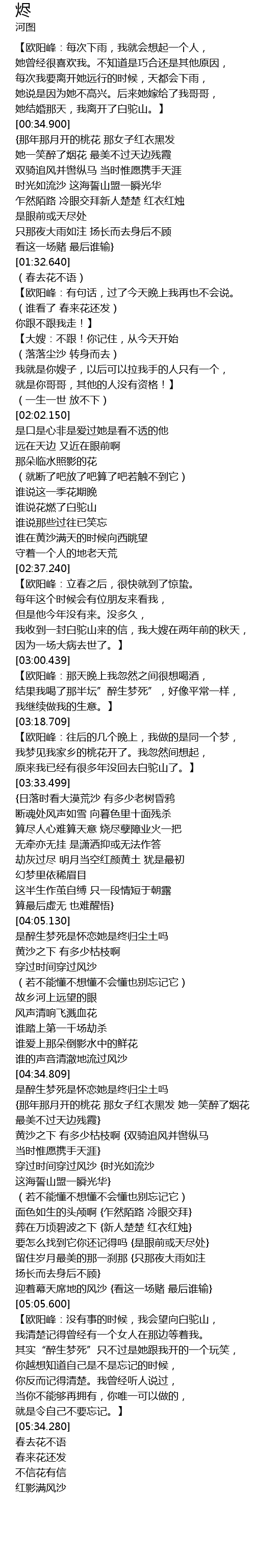 | [04:35.430] | shì zuì shēng mèng sǐ shì huái liàn tā shì zhōng guī chén tǔ ma nà nián nà yuè kāi de táo huā nà nǚ zǐ hóng yī hēi fā tā yī xiào zuì le yān huā zuì měi bù guò tiān biān cán xiá |