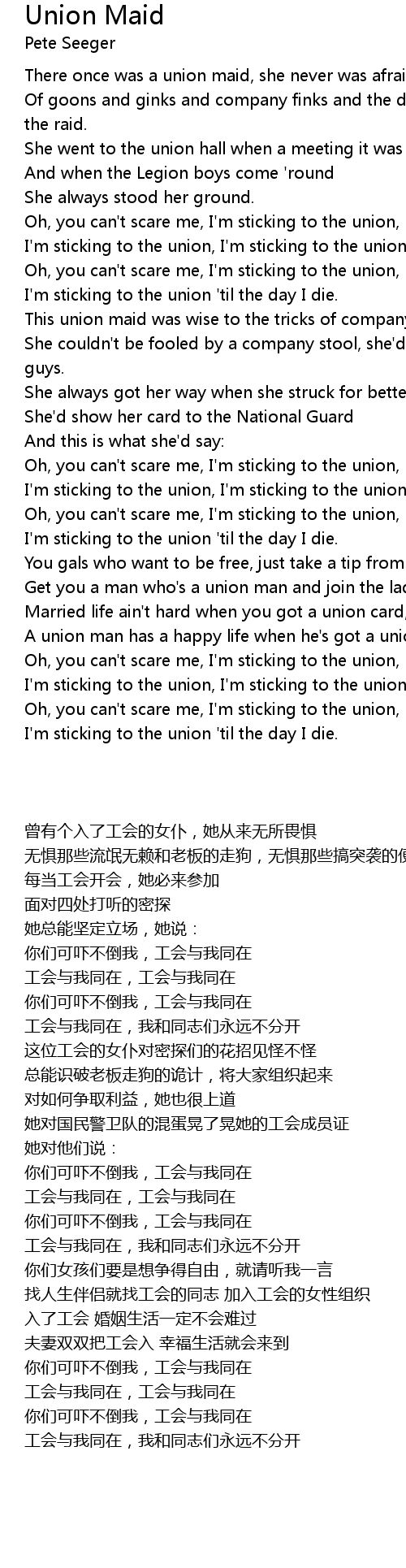 There once was a union maid, she never was afraid |