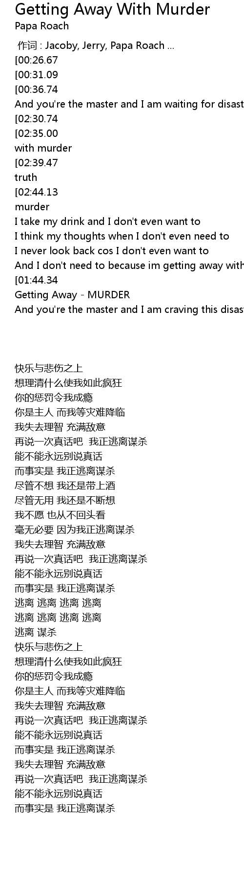 | [02:55.80][02:35.00][01:30.13][00:51.15] | To tell the truth again im getting away with murder |