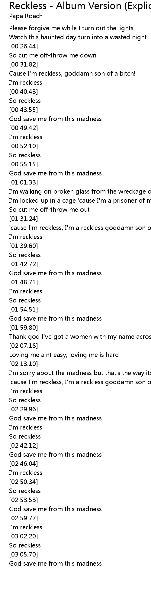 [01:31.99] 'cause I'm reckless, I'm a reckless goddamn son of a bitch!