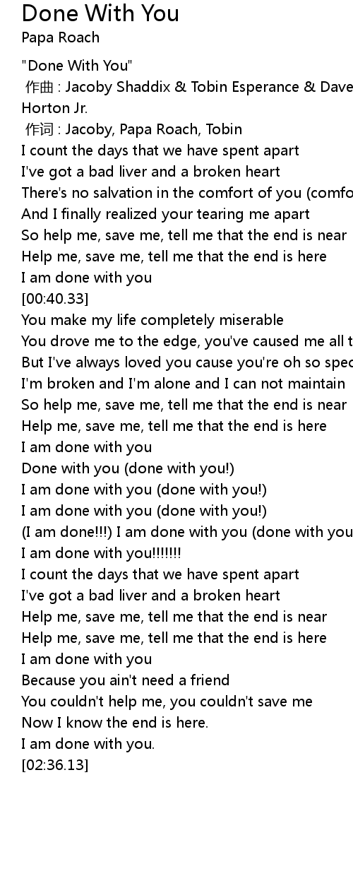 | [01:40.31] | (I am done!!!) I am done with you (done with you!) |