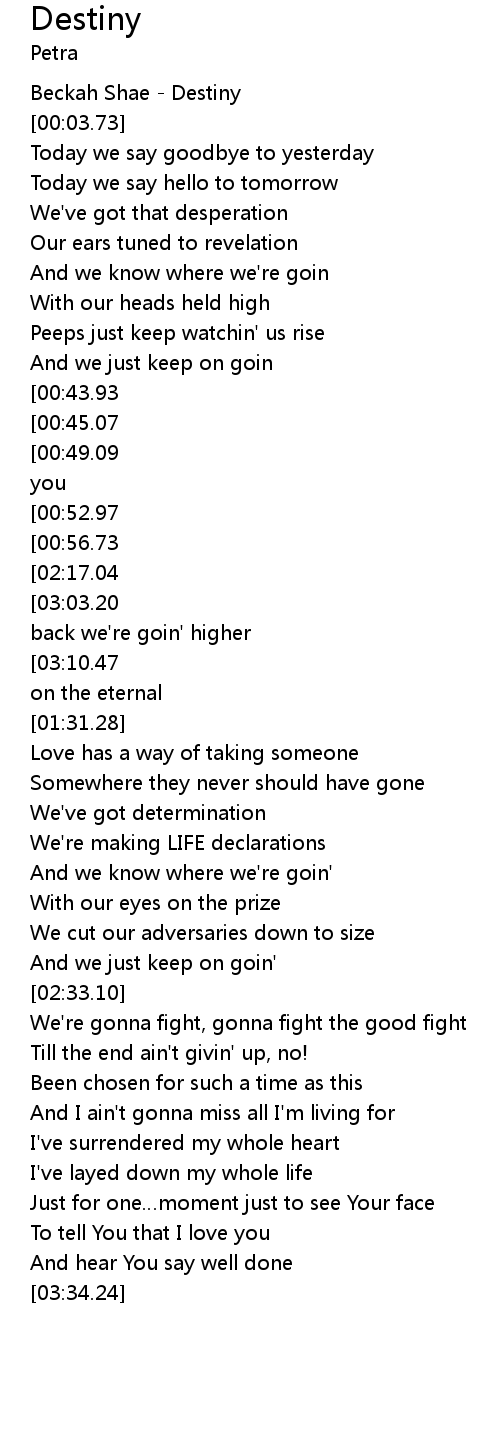 | [03:18.02][03:03.20][02:17.56][01:16.59][01:00.70] | Your DESTINY. Ain' t turning back we' re goin' higher |