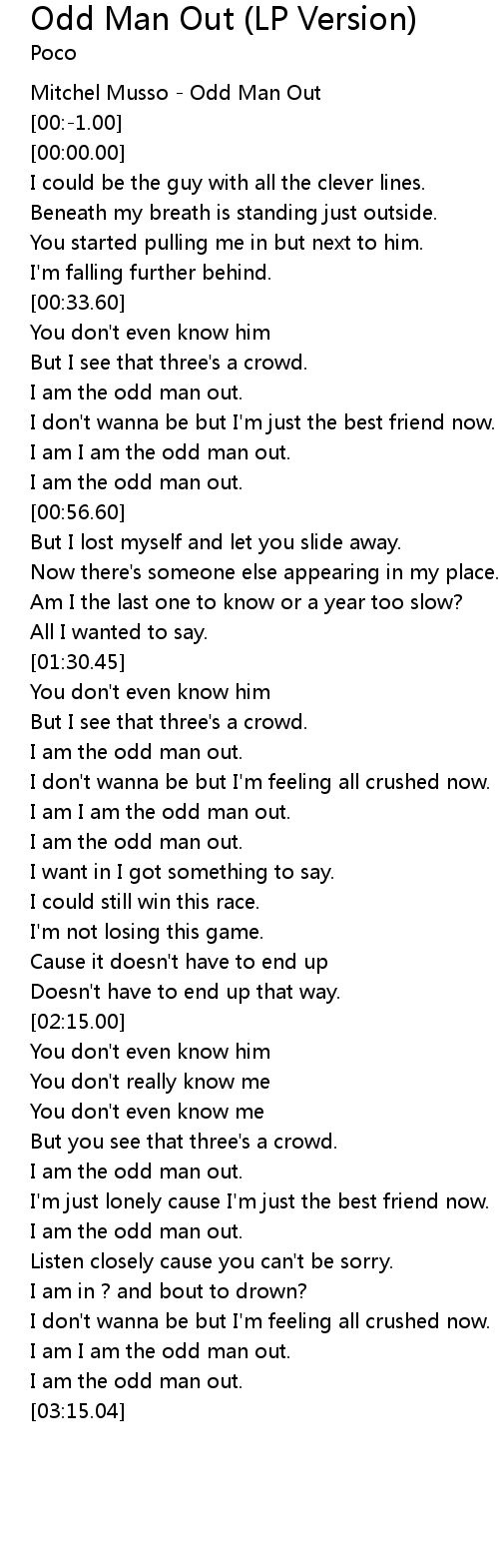| [03:01.82] | I am I am the odd man out. |