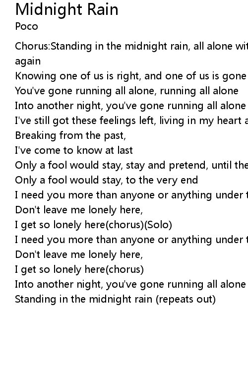 Chorus:Standing in the midnight rain, all alone with the pieces of my heart again |